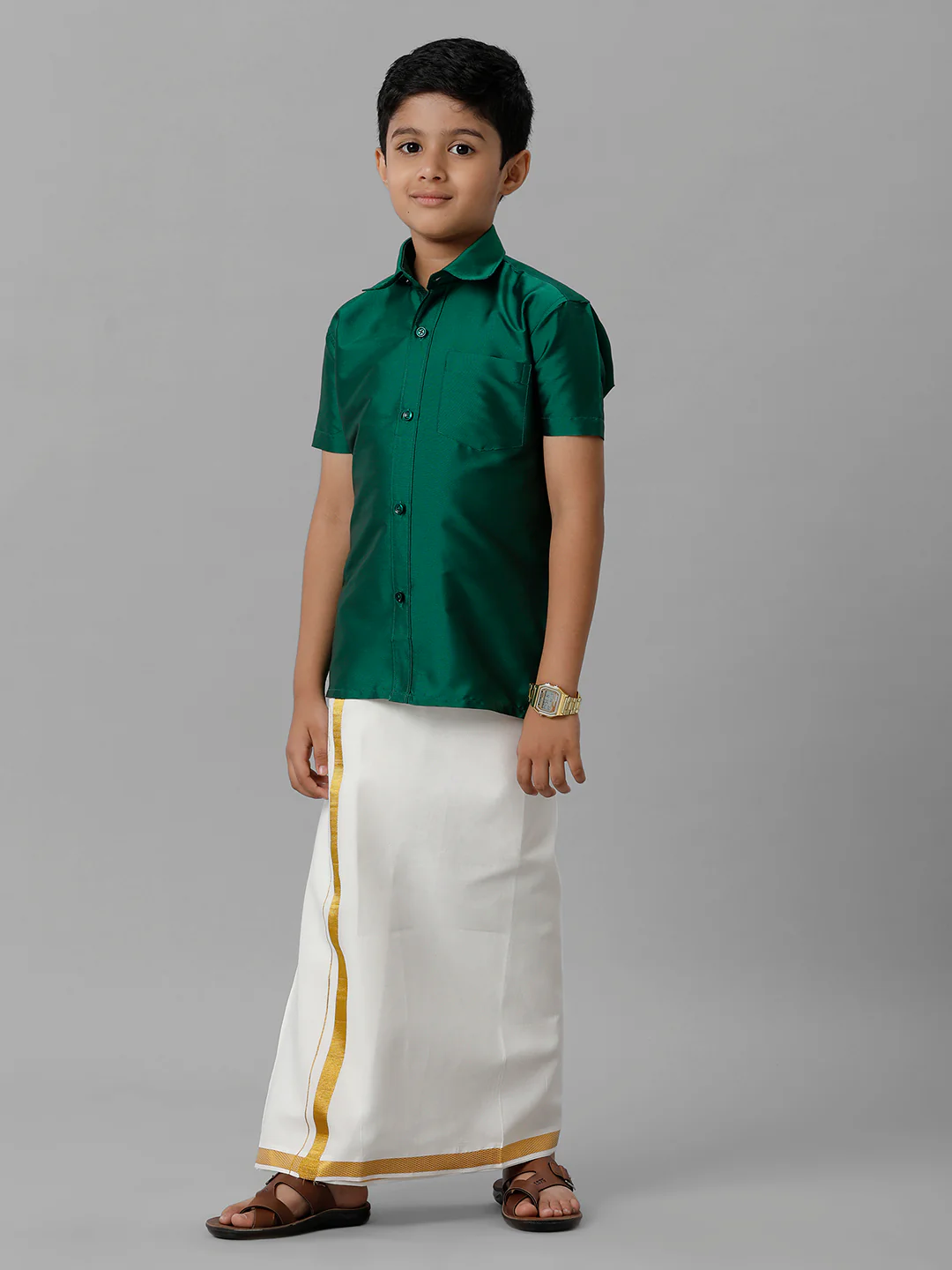 Boys Green Half Sleeves Shirt with Cream Dhoti Combo K9