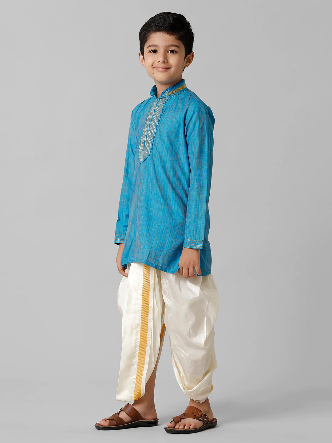The Boys Cotton Colour Kurta with Cream Readymade Art Silk Panchakacham Combo is a perfect blend of traditional style and modern convenience, ideal for young boys attending cultural, religious, or festive events. The set includes a comfortable cotton kurta in vibrant colors, offering breathability and ease of movement, making it perfect for long celebrations. Paired with a cream-colored readymade Panchakacham crafted from art silk, the outfit combines elegance and practicality. The Panchakacham is designed with a drawstring or elastic waistband for a secure fit and easy wear, While the smooth art silk fabric adds a luxurious touch. This combo ensures that your little one is dressed in traditional South Indian attire with minimal effort, offering both comfort and style for weddings, temple visits, and other special occasions.