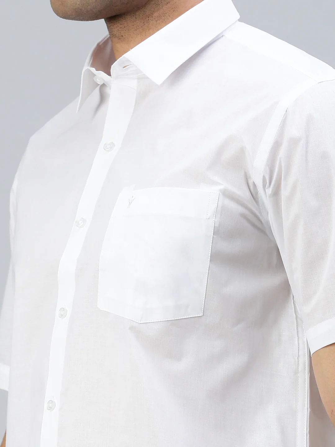 Experience the ultimate fusion of comfort and style with this men's white shirt featuring half sleeves, crafted from 100% premium quality cotton. Meticulously tailored with attention to every detail, this shirt boasts a prestigious fit, while the regular collar adds a touch of classic charm and guarantees unbeatable comfort. The half sleeves not only enhance its stylish appeal but also ensure optimal breath ability, keeping you cool and comfortable even in warm weather. With its impeccable design and superior fabric, this shirt is a symbol of sophistication and refinement, making it an ideal fashion statement for those who seek comfort and style in equal measure.