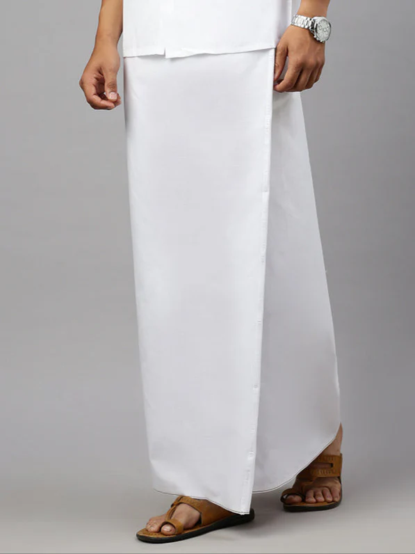 A white paramas dhoti is a traditional and elegant garment, often chosen for its simplicity and cultural significance. Made from cotton or similar lightweight fabric, the dhoti is predominantly white, symbolizing purity and grace. It is distinguished by a broad, contrasting border, often in shades of white which adds a regal and refined touch. The paramas dhoti is worn by wrapping it around the waist and draping it elegantly between the legs, creating a comfortable yet dignified silhouette. This dhoti is popular for religious ceremonies, and formal cultural events, offering a timeless, sophisticated look that blends tradition with grace.