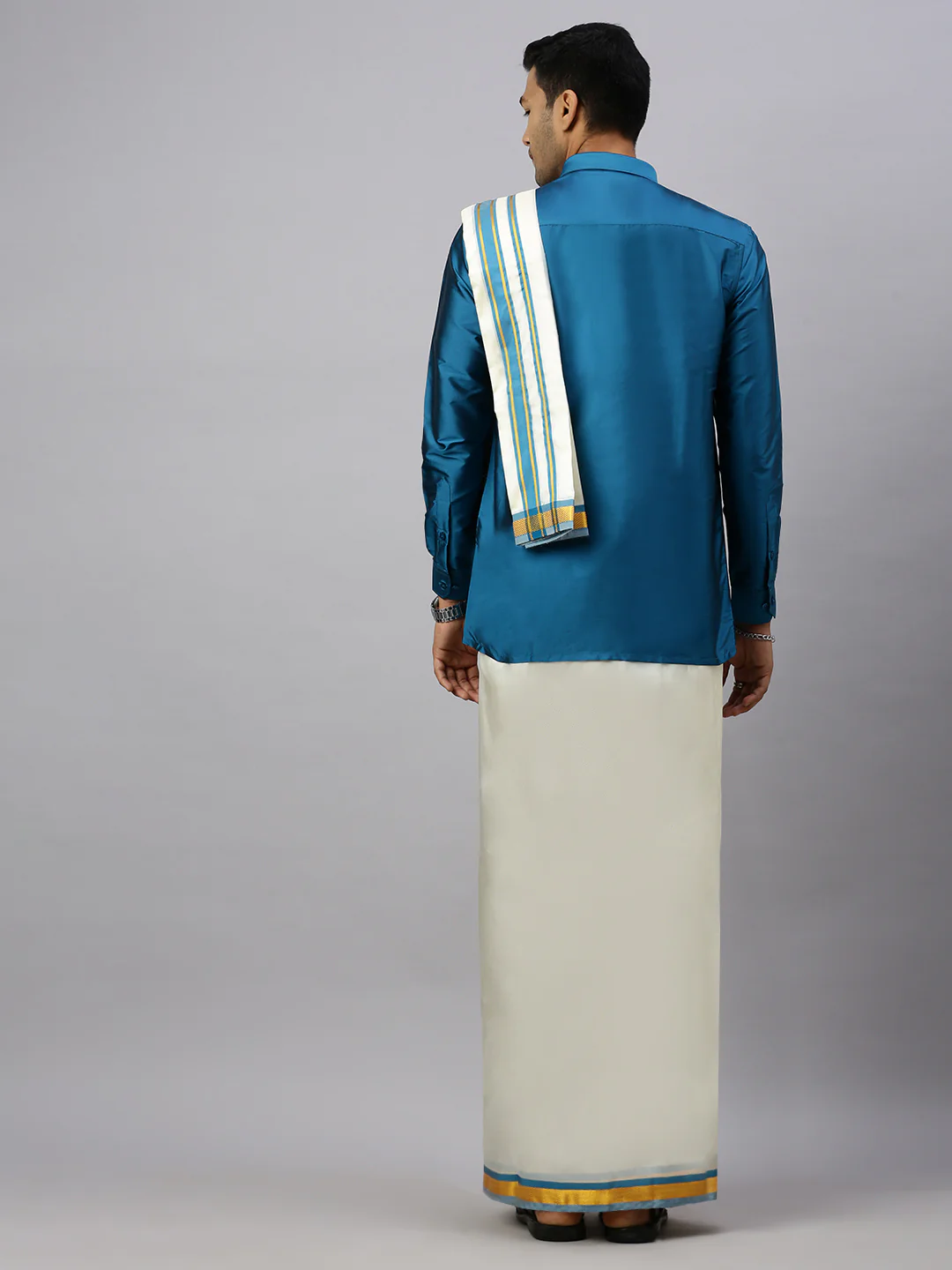 Men Full Sleeves Ramar Blue Shirt with Matching Border Cream Dhoti & Towel Set