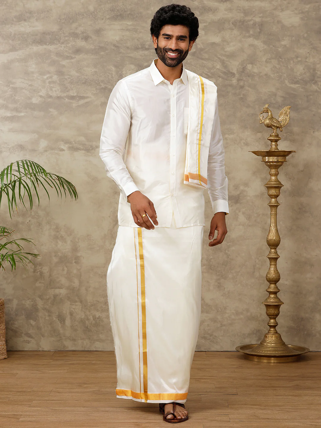 Men Silk Cream with 1" inch Jari Border Towel Suba Vivaga